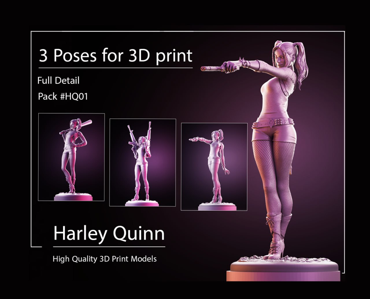 Harley quinn triple pose pack STL files for 3d printing and 3D Models – The models are optimized for all types of 3D Printing , SLA / SLS / FDM / DLP Types of 3D printing .